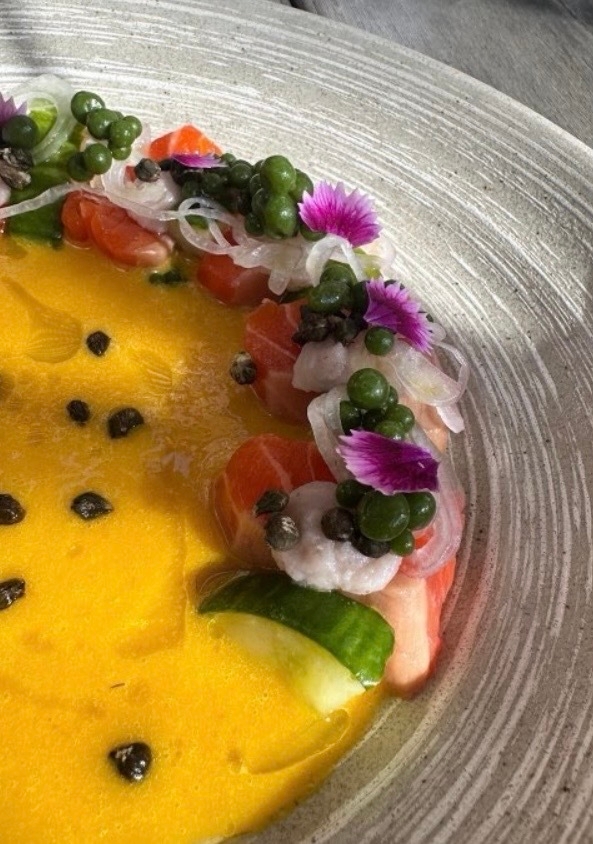 Tasmanian ocean trout, passion fruit ponzu, coconut taro, toasted capers, sakura pearls