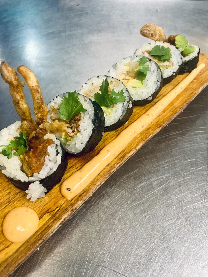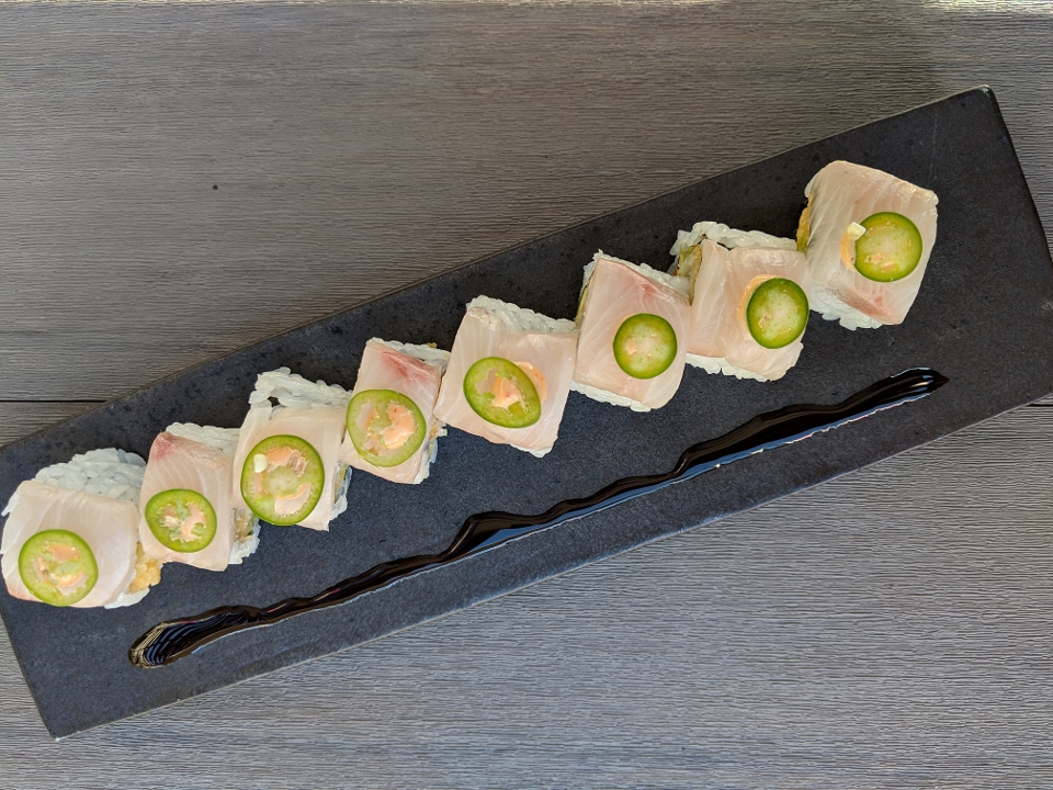 Tempura shrimp, avocado, pickled cucumber & carrot, panko togarashi, topped with dutch yellowtail, serrano, spicy mayo, lemongrass soy
