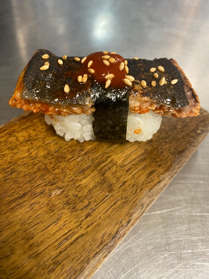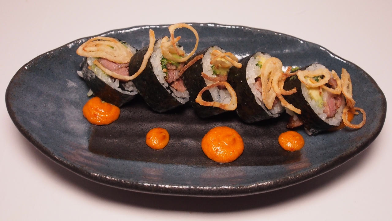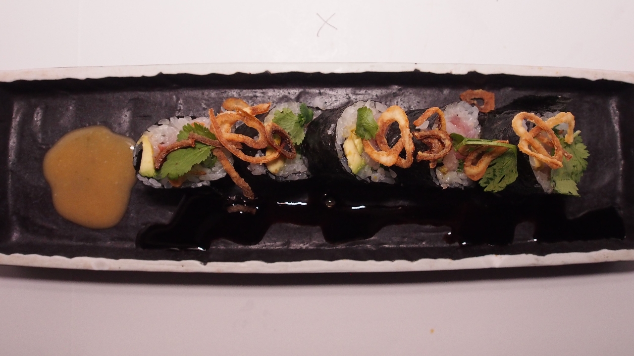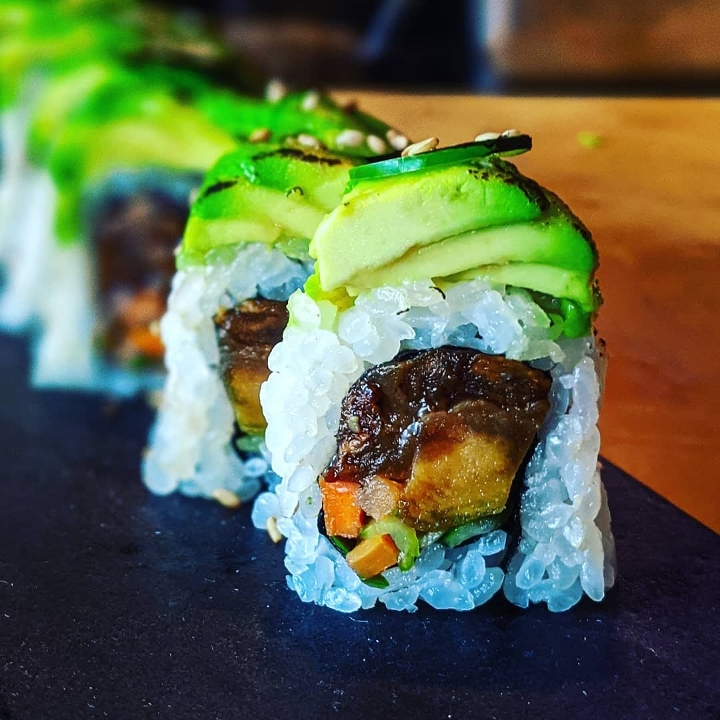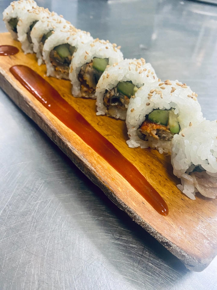 Freshwater eel, cucumber, avocado, banana pear BBQ sauce