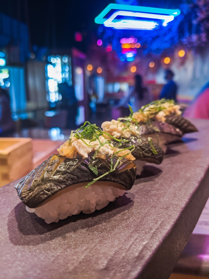 Miso grilled eggplant, sesame, pickled cucumber & carrot, topped with avocado and serrano, yuzu miso sauce, sesame *Vegan*