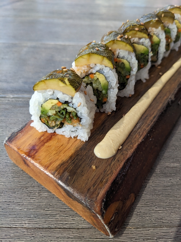 Rice Flour tempura roll, salmon, pickled cucmber, cashew salsa macha, avocado, dill, shishito ranch