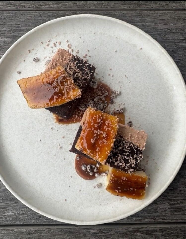 gluten free chocolate cake, coffee mousse, bruleed bananas, cocoa nibs