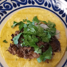 4 taquitos. Steamed marinated beef cheek topped with onions, cilantro, lime, and agua fresca