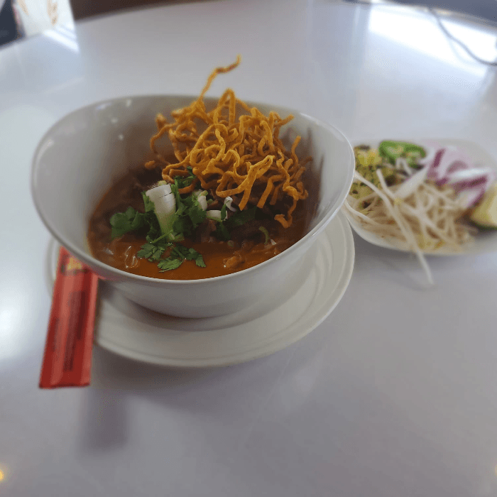 Flat egg noodles with yellow curry and your choice of protein. Topped with crispy egg noodle, green onions and cilantro. Served with pickle mustard, bean sprouts, and lime
