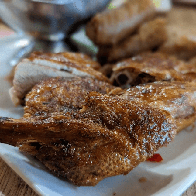 Deep fried half duck with veggies tempura (sweet potatoes and eggplants) and sliced kiwi. Served with special tamarind sauce