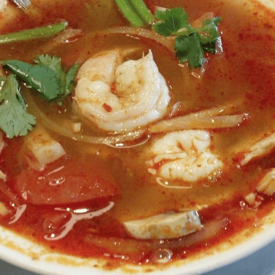 Spicy & tangy shrimp soup which includes squid, scallion and shrimp flavored with fresh basil, onion, ginger,lemongrass and Thai chili.