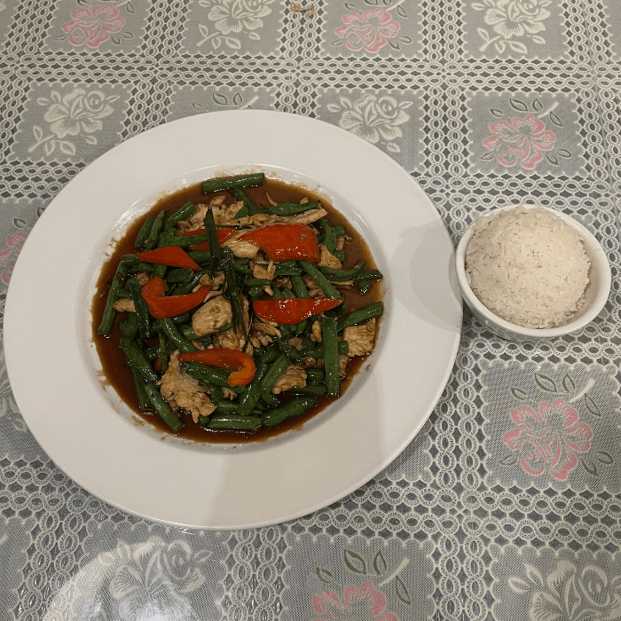 Choice of protein sauteed with yellow onion, bell pepper and string bean in thai basil sauce. topped with a fried egg.