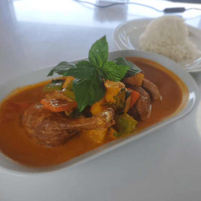 Roasted duck in red curry sauce with grape, tomatoes, bell peppers, pineapple, lychee, and basil