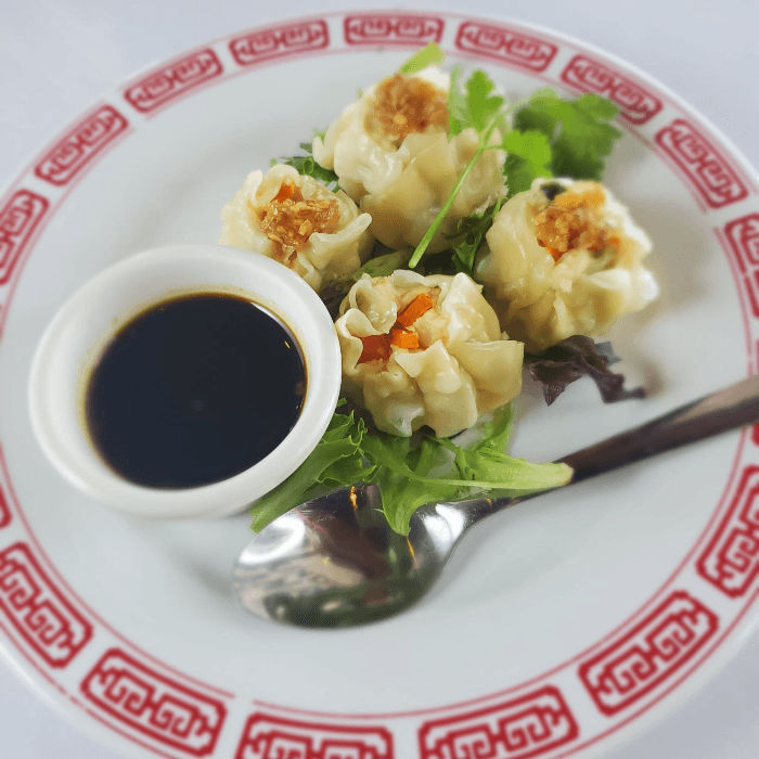 4 pieces. Steamed ground shrimp and chicken, shiitake mushroom, chestnut peas and carrots wrapped in wonton skin. Served with sweet & tangy soy sauce. Topped with fried garlic.