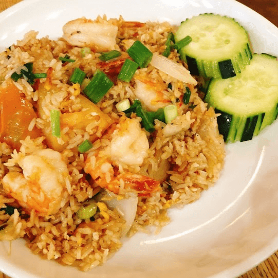 Sweet fried rice with peas & carrots, mix soy sauce, chunk sweet pineapple, cashew nuts, raisins, egg, & mixed soy sauce