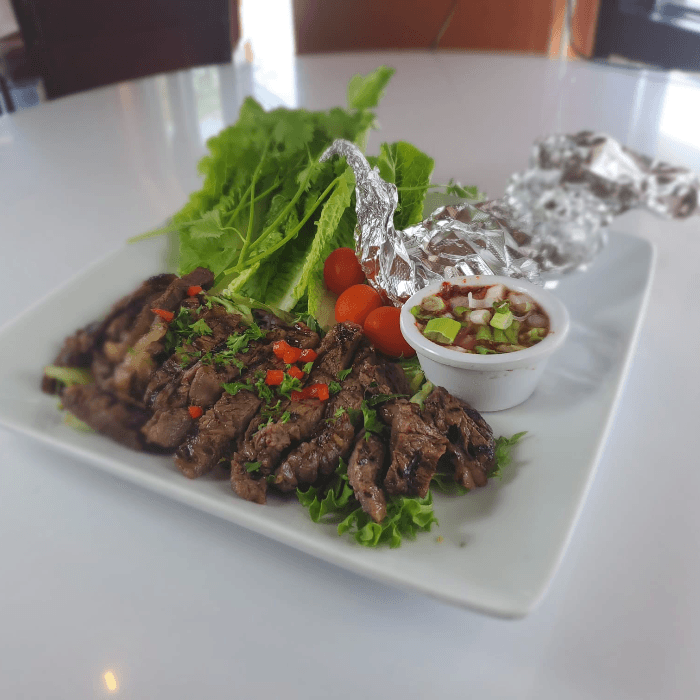 Grilled beef slices tossed with onions, scallions, cucumbers, tomatoes, and carrots in Thai chili-lime dressing over chopped iceberg lettuce