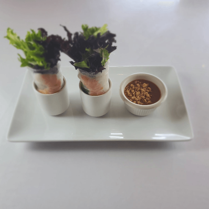 Rice paper rolls stuffed with choice of protein: shrimp or soft tofu, veggies, cucumbers, carrots, basil, mint leaves, and vermicelli noodles served with peanut sauce.