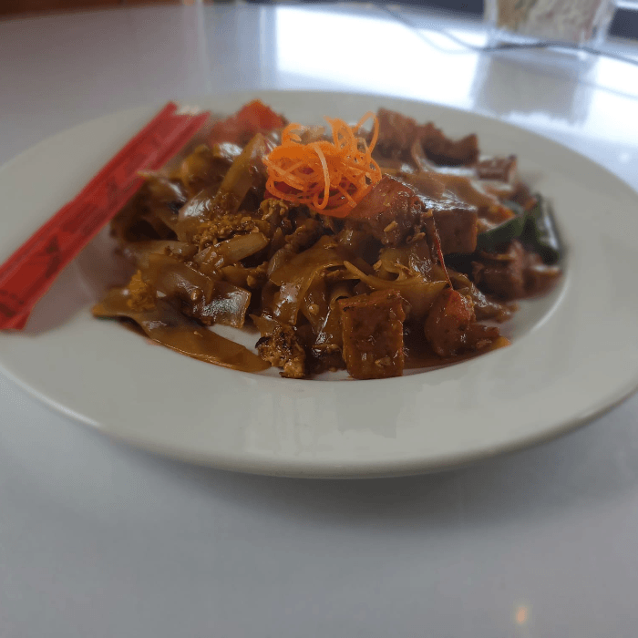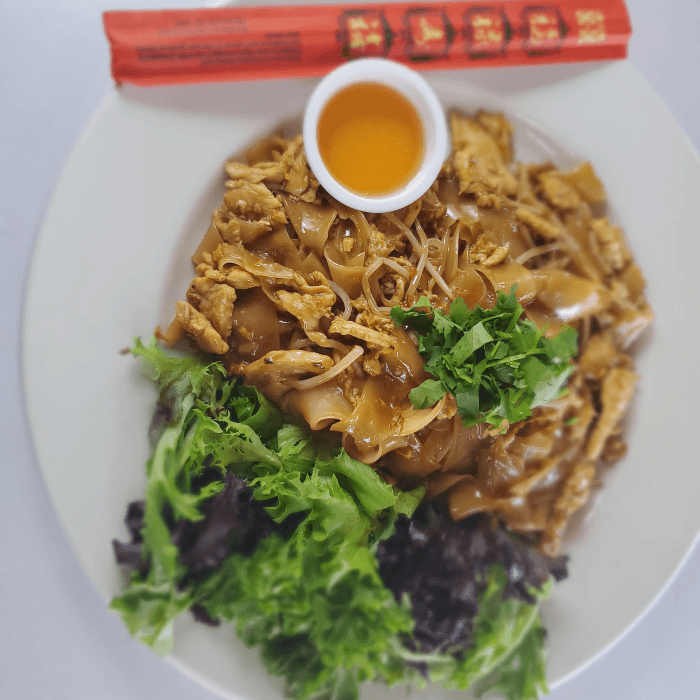 Flat-rice noodles stir-fried with choice of meat, Chinese broccoli and egg an imported dark thai soy sauce.