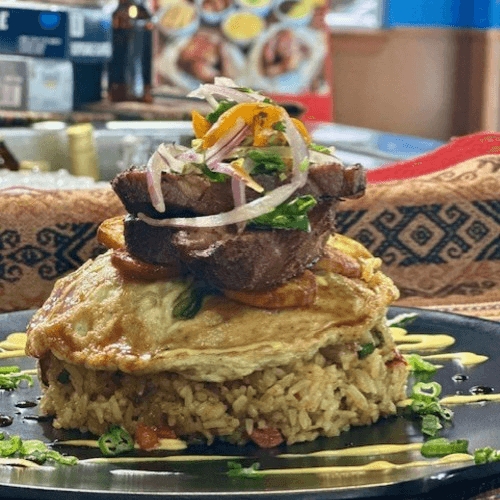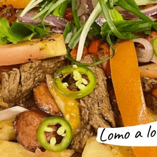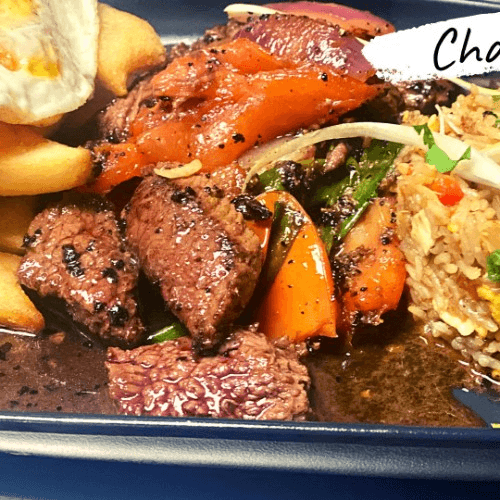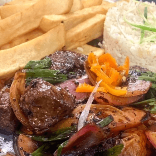Beef sirloin stir fry in our special lomo sauce with red onions and tomatoes, served with a side of arroz chaufa, french fries and an egg