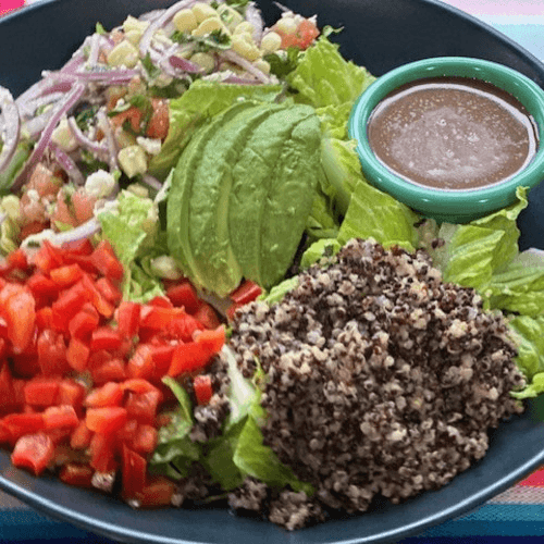 Kale & romaine mix, organic quinoa, solterito (corn, queso fresco, tomatoes, red onions), red peppers, avocado, and passion fruit vinaigrette dressing