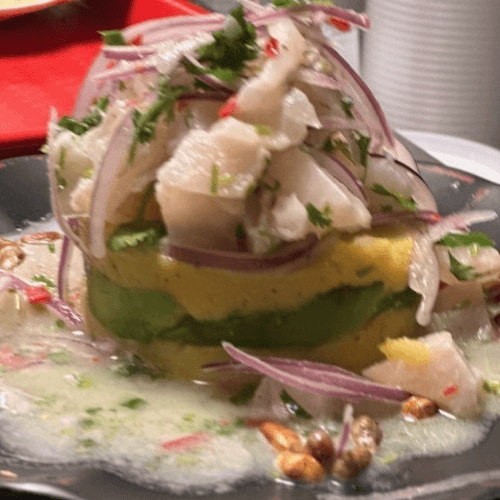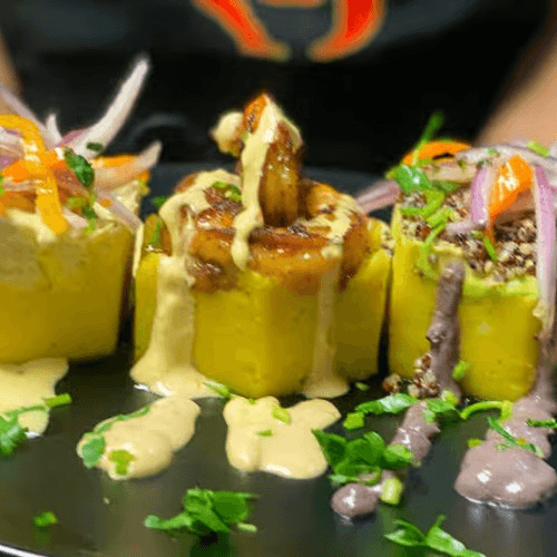 Cold mashed potato mixed with aji amarillo paste, lime juice, avocado. Topped with Ceviche