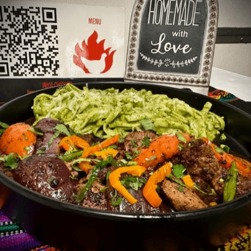Pasta with peruvian pesto sauce with parmesan cheese. Served with lomo al jugo. Beef sirloin stir fry in our special lomo sauce with red onions and tomatoes