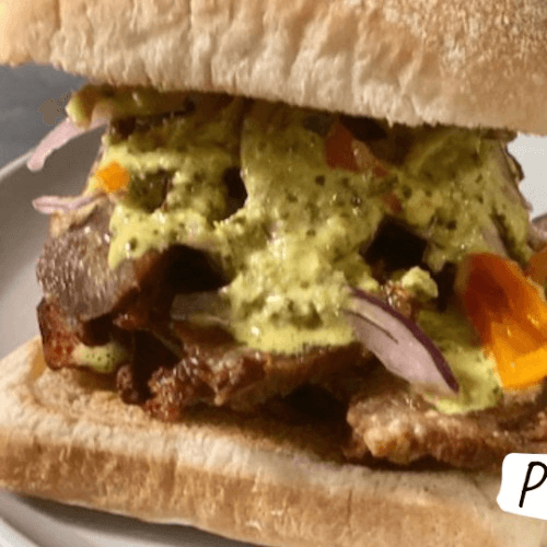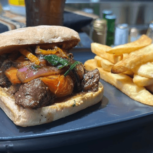 Peruvian beef sirloin stir fry in our special lomo sauce with onions, tomatoes, cilantro, rocoto mayo sauce, served on ciabatta bread