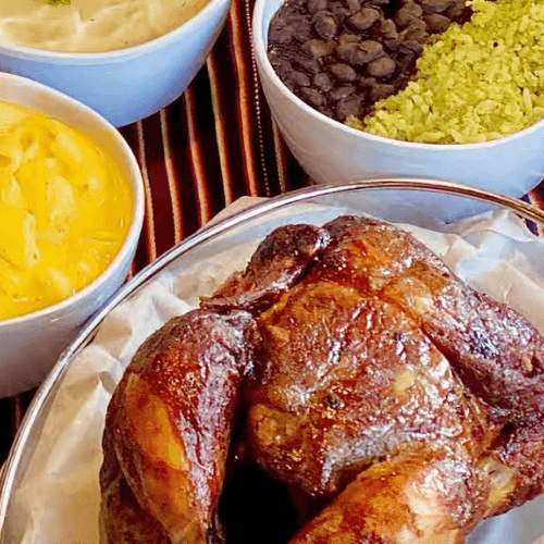 Feeds 4+. 1 whole chicken cut into 4 pieces, 4 large sides of your choice, complementary canchita or 8 fresh white corn tortillas & 2 -4 oz sauces