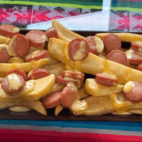Steak potato fries topped with beef sirloin stir fry in our special lomo sauce, fried hot dog links, fresh tomatoes, sarza criolla and fresh jalapenos links