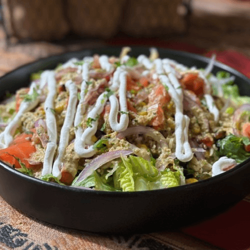 Flour tortilla fried and filled with cilantro rice, black beans, fire roasted corn with organic quinoa, lettuce, onions and tomatoes in our house balsamic vinaigrette, creamy huacatay sauces, sour cream, served over homemade melted cheddar cheese
