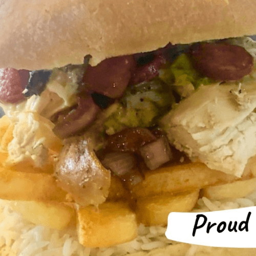 Pulled rotisserie chicken, fried hot dogs, white rice, french fries, tomatoes, red onions in our house balsamic vinaigrette, mild and spicy sauce, all inside ciabatta bread
