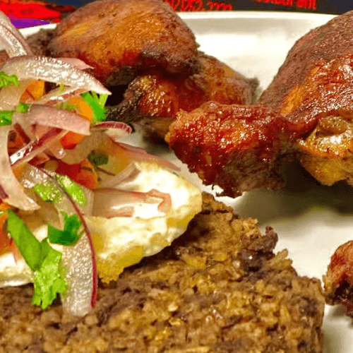 Beef sirloin stir fry in our special lomo sauce with red onions and tomatoes, served with a side of french fries and white rice