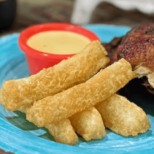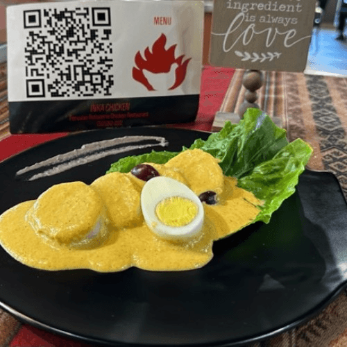 Boiled potatoes topped with creamy aji amarillo sauce sauteed with red onions, garlic, queso fresco and crackers