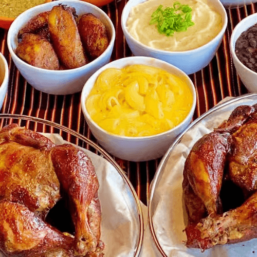 Feeds 8+. 2 whole chickens, 5 large sides of your choice, complementary canchita or 16 fresh white corn tortillas, & 4 -4 oz sauces
