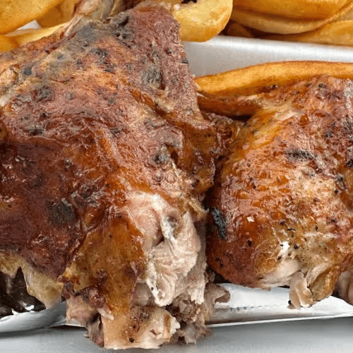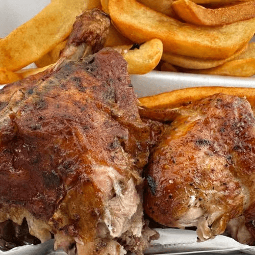 Feeds 2-4. 1 whole chicken cut into 4 pieces, 2 large sides of your choice, complementary canchita or 8 fresh white corn tortillas & 2 -4 oz sauces
