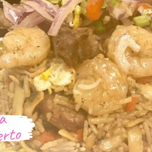 Peruvian fried rice, garlic, green onions, red peppers, eggs, gluten free soy sauce, with a mix of seafood. Octopus, calamari, shrimp, clams, and mussels. Topped with sarza criolla