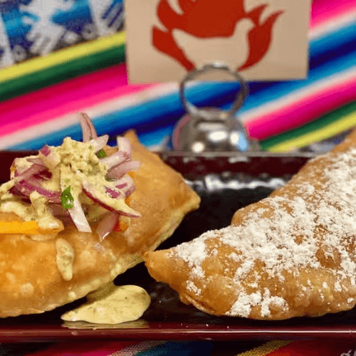 2 deep fried fresh white corn tortillas, cilantro rice, black beans, homemade melted Cheddar cheese, kale romaine mix, onions and tomatoes in our house balsamic vinaigrette, sour cream, creamy huacatay sauce