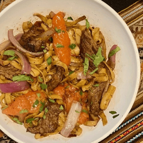 Pasta with Beef sirloin stir fry in our special lomo sauce with red onions and tomatoes