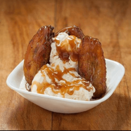 Vanilla ice cream, warm plantains and homemade white chocolate fudge