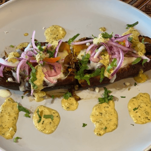 Canoa de platano! Whole sweet plantain filled with your choice of beef or chicken. Topped with mozzarella cheese, sarza criolla and creamy huacatay sauce