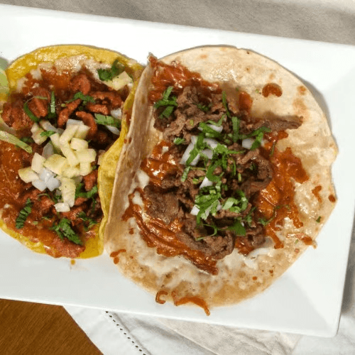 Combination of bistek or fajita and al pastor with onions, cilantro, and optional pineapple