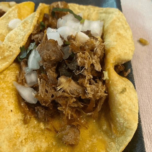 Roasted pulled pork cooked in its own juices and garnished with onions and cilantro on your choice of tortilla