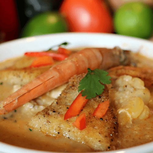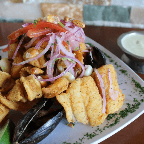 Breaded fish, calamari and shrimps served over a bed of fried yucca with onion salad and nuggets of toasted corn