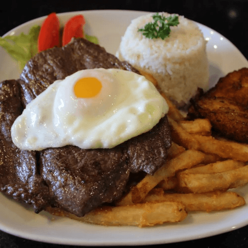 Steak or chicken plate served with plantains, a fried egg, french fries and garlic rice