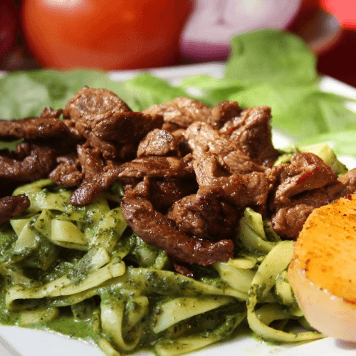 Noodles in a lima-style pesto sauce make from cilantro served with steak, chicken or vegetarian