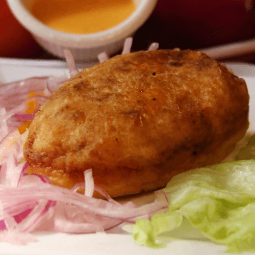 Crispy fried potato stuffed with seasoned beef, onions, olives, and hard-boiled egg. Golden on the outside and savory on the inside