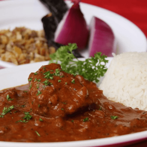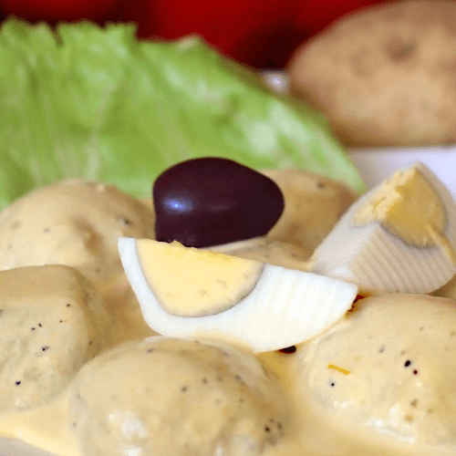 Shredded chicken breast in a parmesan cheese, pecan and yellow pepper sauce. Served with potatoes, an alive, a slice of a hard-boiled egg and rice