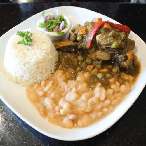 Beef cooked with chicha de jora and cilantro. Served with canario beans and rice