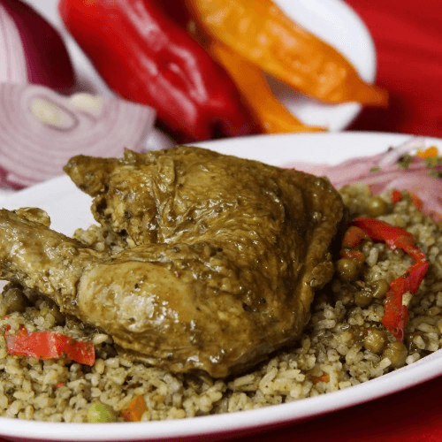 Chicken and rice plate made in a cilantro and red peppers sauce