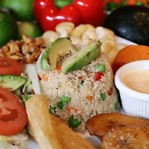 Quinoa salad with carrots, peas and avocado, plantains, fried yucca, peruvian white corn, sweet potato, criolla salad, huancaina sauce, and toasted com