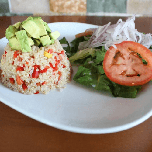 Quinoa, lettuce, tomato, onion, and avocado