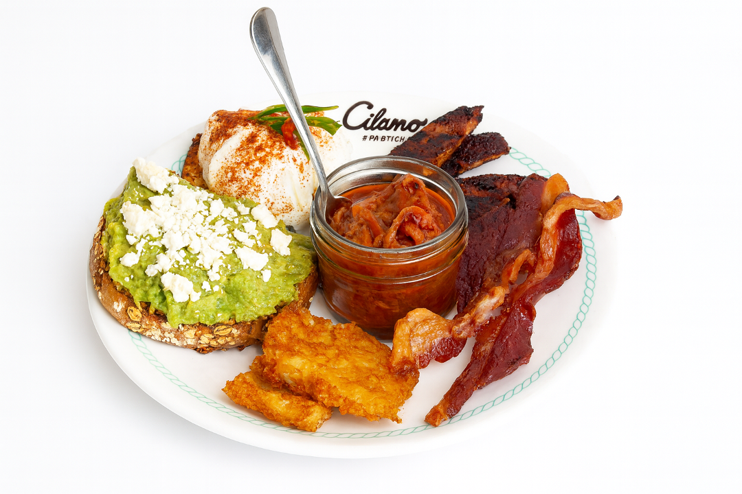 Two poached eggs, multigrain toast, bacon, chicken sausage, smashed avocado, chorizo baked beans and hash browns
