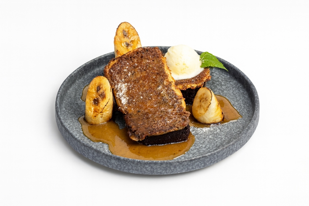 Maple banana bread French toast, caramelized banana, mascarpone, miso butterscotch, black sesame soy powder, garnished with mint