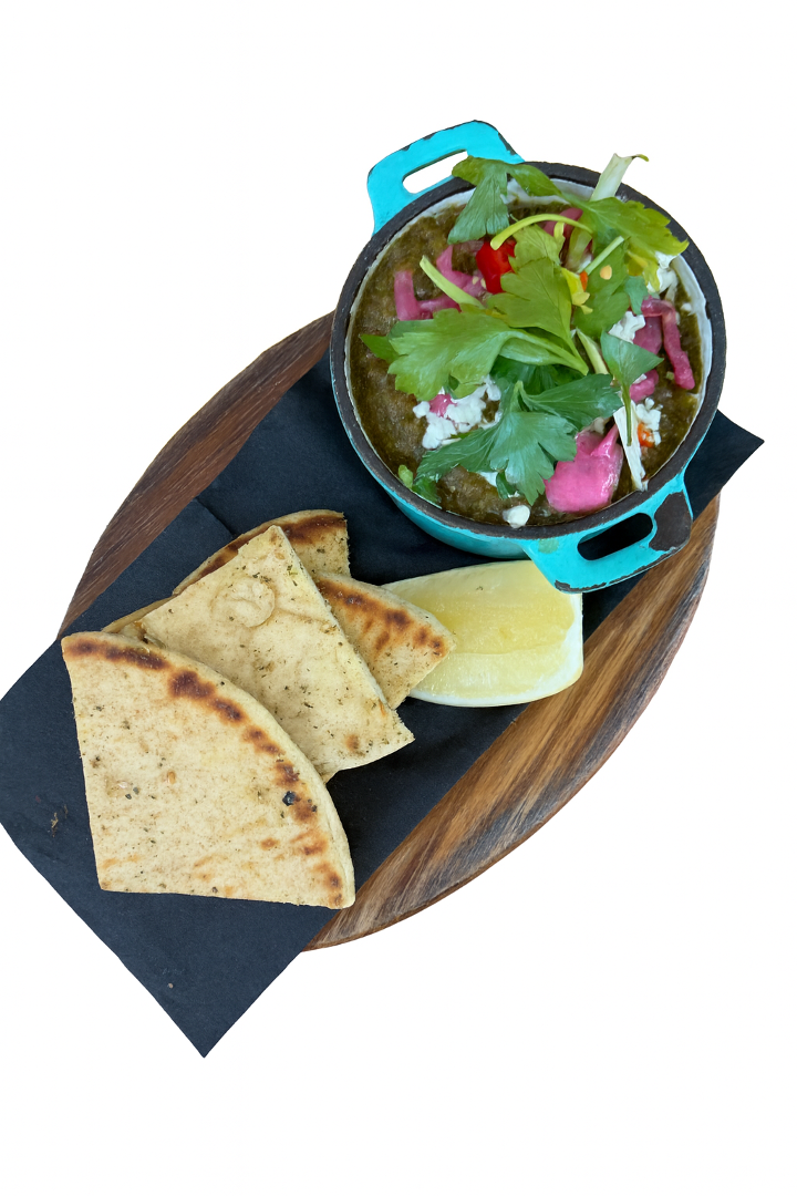 Tomatillo, poblano, cannellini beans, kale, spinach, dill yogurt, feta, poached eggs, pickled onion, pumpkin seeds, Za'atar pita chips