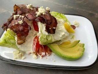 Crisp iceburg wedge, brown sugar spiced bacon strips, avocado, cherry tomatoes and blue cheese